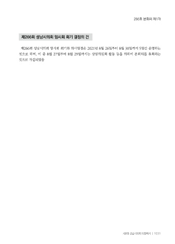 266회 본회의 제1차 제266회 성남시의회 임시회 회기 결정의 건 제266회 성남시의회 임시회 회기와 의사일정은 2021년 8월 26일부터 8월 30일까지 5일간 운영하는 것으로 하며, 이 중 8월 27일부터 8월 29일까지는 상임위원회 활동 등을 위하여 본회의를 휴회하는 것으로 가결되었음 제8대 성남시의회 의정백서 ㅣ 1031