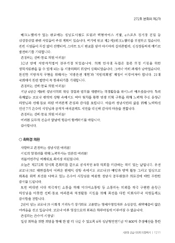 의장님과 선배·동료 의원 여러분께 존경과 감사를 표합니다. 아울러 성남시민의 삶을 위해 노력하신