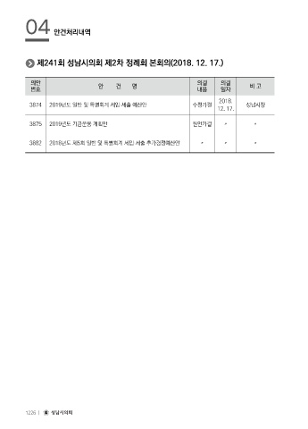 04 안건처리내역 제241회 성남시의회 제2차 정례회 본회의(2018. 12. 17.) 의안 안 건 명 의결 의결 비 고 번호 내용 일자 2018. 3874 2019년도 일반 및 특별회계 세입·세출 예산안 수정가결 성남시장 12. 17. 3875 2019년도 기금운용 계획안 원안가결 〃 〃 3882 2018년도 제5회 일반 및 특별회계 세입·세출 추가경정예산안 〃 〃 〃 1226 ㅣ 성남시의회