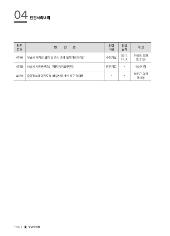 04 안건처리내역 의안 안 건 명 의결 의결 비 고 번호 내용 일자 2019. 이상호 의원 4186 성남시 주차장 설치 및 관리 조례 일부개정조례안 수정가결 11. 4. 등 31명 4188 성남시 시민옴부즈만 임명 동의요구(안) 원안가결 〃 성남시장 박호근 의원 4189 중앙정부와 경기도의 매칭사업 개선 촉구 결의문 〃 〃 등 9명 1246 ㅣ 성남시의회