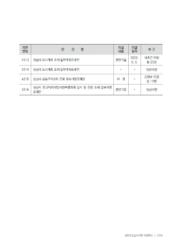 의안 안 건 명 의결 의결 비 고 번호 내용 일자 2020. 박호근 의원 4313 성남시 도시계획 조례 일부개정조례안 원안가결 6. 3. 등 20명 4314 성남시 도시계획 조례 일부개정조례안 〃 〃 성남시장 김명수 의원 4315 성남시 공동주택관리 조례 일부개정조례안 부 결 〃 등 12명 성남시 판교택지개발사업특별회계 설치 및 운용 조례 일부개정 4316 원안가결 〃 성남시장 조례안 제8대 성남시의회 의정백서 ㅣ 1255