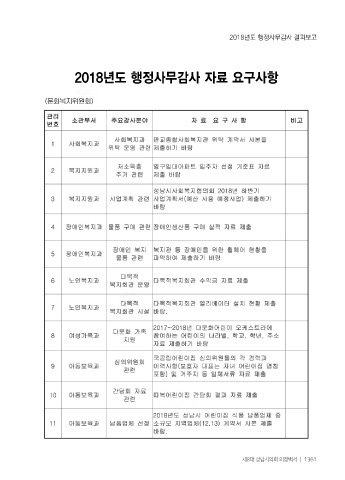 2018년도 행정사무감사 결과보고 2018년도 행정사무감사 자료 요구사항 제8대 성남시의회 의정백서 ㅣ 1361