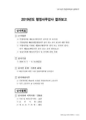 2019년도 행정사무감사 결과보고 2019년도 행정사무감사 결과보고 제8대 성남시의회 의정백서 ㅣ 1403