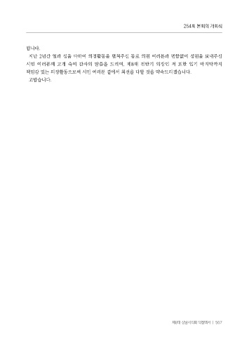 254회 본회의 개회식 됩니다. 지난 2년간 열과 성을 다하여 의정활동을 펼쳐주신 동료 의원 여러분과 변함없이 성원을 보내주신 시민 여러분께 고개 숙여 감사의 말씀을 드리며, 제8대 전반기 의장인 저 또한 임기 마지막까지 책임감 있는 의정활동으로써 시민 여러분 곁에서 최선을 다할 것을 약속드리겠습니다. 고맙습니다. 제8대 성남시의회 의정백서 ㅣ 567