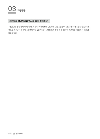 03 의정활동 제257회 성남시의회 임시회 회기 결정의 건 제257회 성남시의회 임시회 회기와 의사일정은 2020년 9월 3일부터 9월 7일까지 5일간 운영하는 것으로 하며, 이 중 9월 4일부터 9월 6일까지는 상임위원회 활동 등을 위하여 본회의를 휴회하는 것으로 가결되었음 670 ㅣ 성남시의회