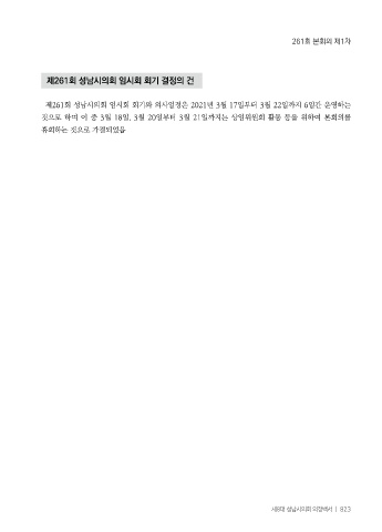 261회 본회의 제1차 제261회 성남시의회 임시회 회기 결정의 건 제261회 성남시의회 임시회 회기와 의사일정은 2021년 3월 17일부터 3월 22일까지 6일간 운영하는 것으로 하며 이 중 3월 18일, 3월 20일부터 3월 21일까지는 상임위원회 활동 등을 위하여 본회의를 휴회하는 것으로 가결되었음 제8대 성남시의회 의정백서 ㅣ 823